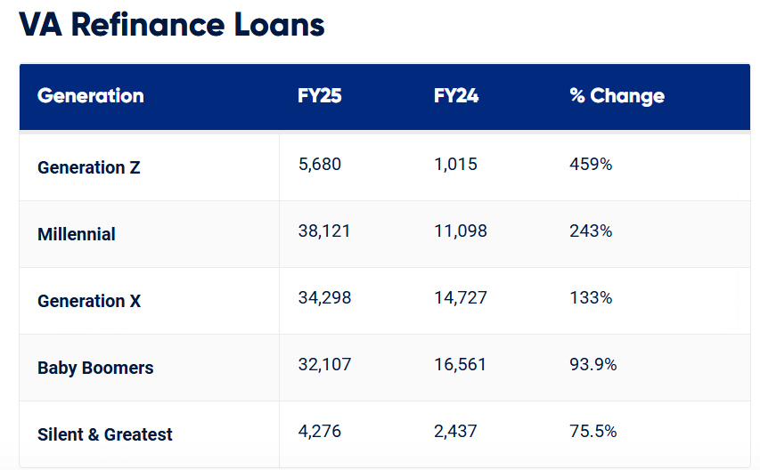 Gen Z veterans and servicemembers led all age demographics in half-year over half-year growth, including a 459% increase in VA refinance loans. The spike in refis could reflects the wave of first-time homeowners capitalizing on an improved rate environment compared to just a year or two ago.
